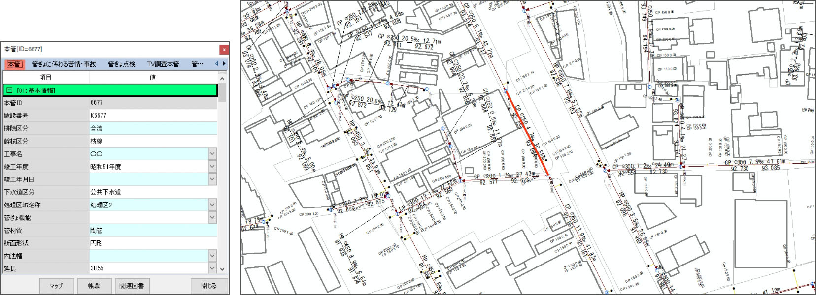 図面上で施設や設備の情報を管理し、選択クリックすることで設備諸元の確認や写真台帳を出力することができます。