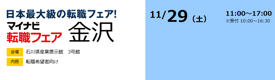 令和7年11月29日(土)に 石川県産業展示館 3号館において開催の「マイナビ転職フェア金沢」に出展します!