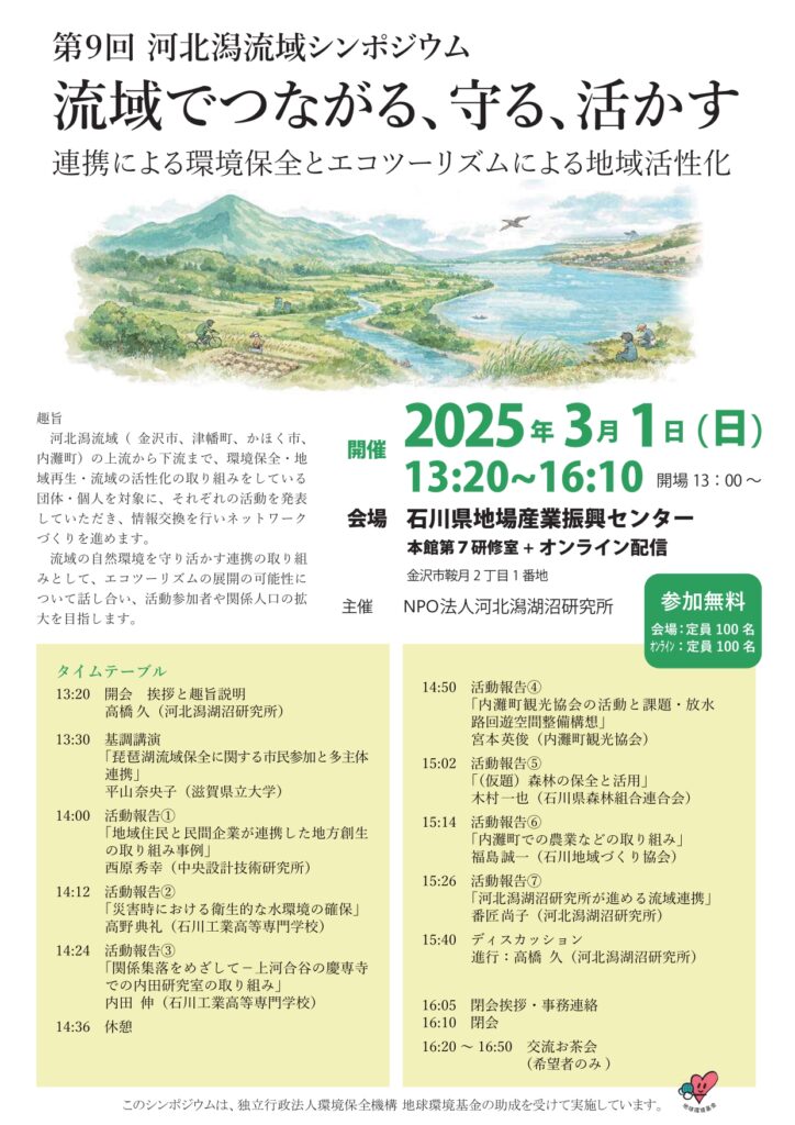 NPO法人河北潟湖沼研究所主催の第9回河北潟流域シンポジウムにて、代表取締役社長の西原が講演いたします。本シンポジウムは、河北潟流域(金沢市、津幡町、かほく市、内灘町)で環境保全や地域再生に取り組む方々の活動発表会です。 流域の豊かな自然を守り、次世代へ活かすためのネットワークを広げ、活動への参加者や関係人口を増やすことを目的としています。