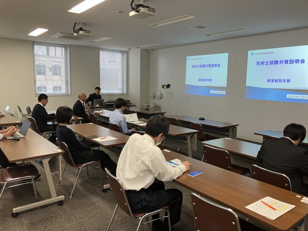 令和8年度の技術士第二次試験受験対象者総勢9名(Web参加2名を含む)が参加し、市村技術統括本部長、佐竹経営統括本部長が講師となり、試験対策全般の留意事項や技術士に求められる資質能力(コンピテンシー)、解答作成のテクニック等について、講義を行いました。