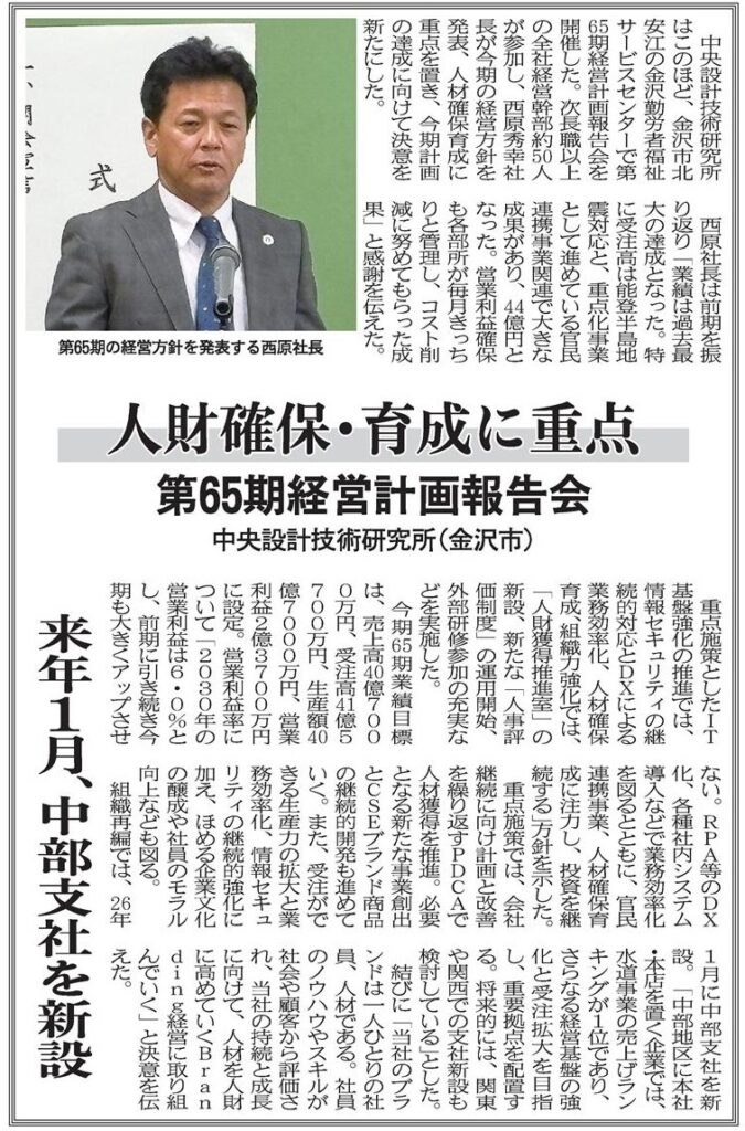 建設工業新聞 第65期経営計画報告会に関する記事が掲載されました